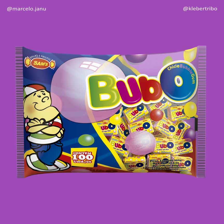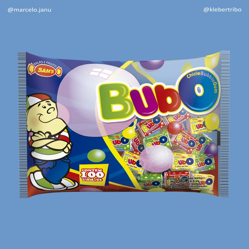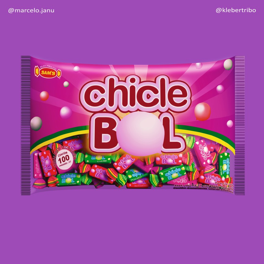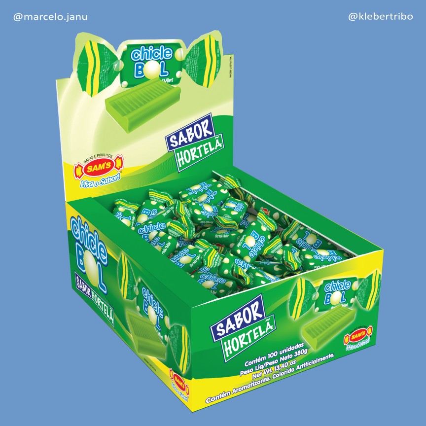 Dentre os produtos Sam’s, produzi ilustrações para os Chicletes, que são pouco explorados e tem apenas 3 sabores. Meus favoritos são as caixetas expositoras ChicleBol, marca que infelizmente saiu de linha.