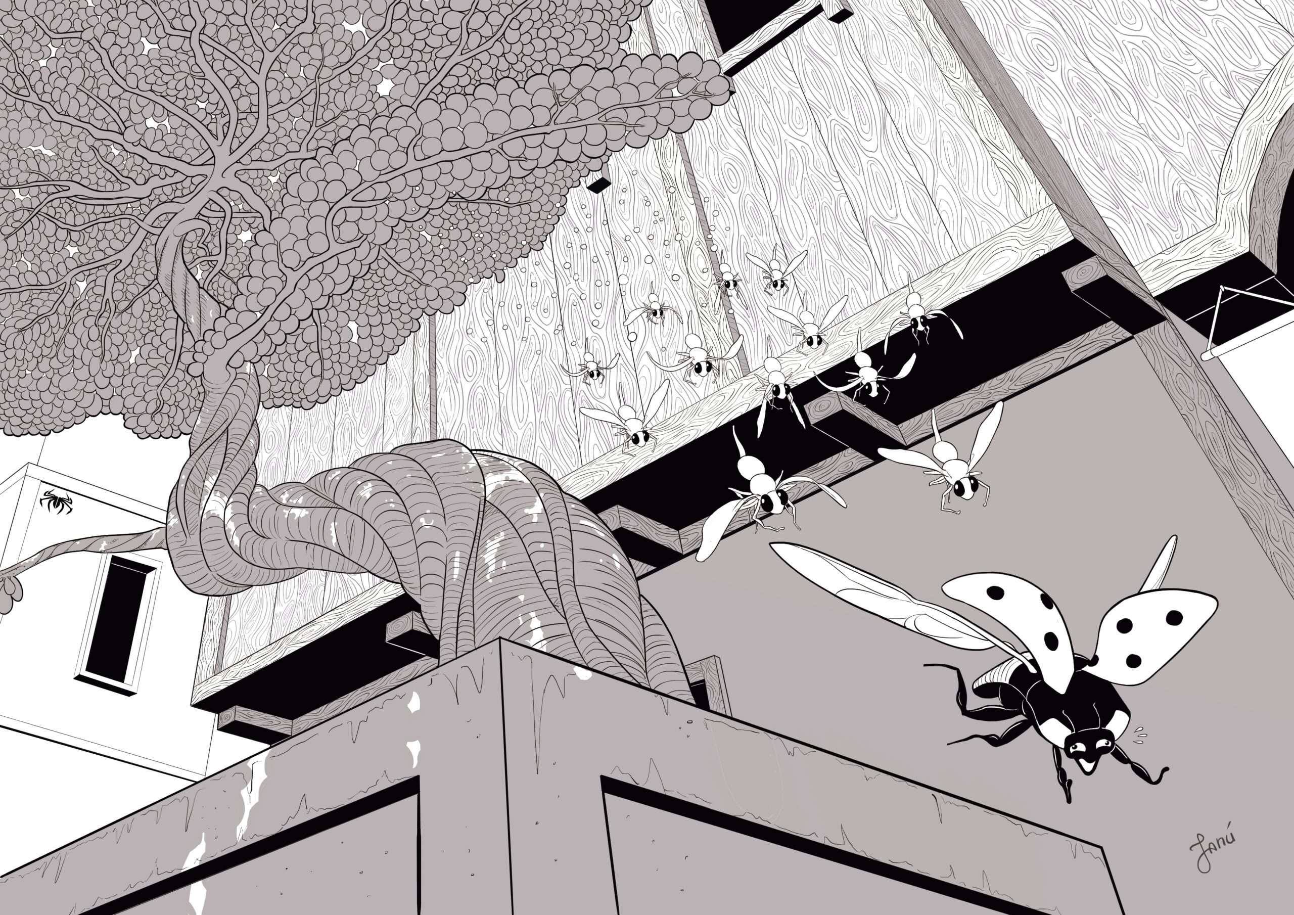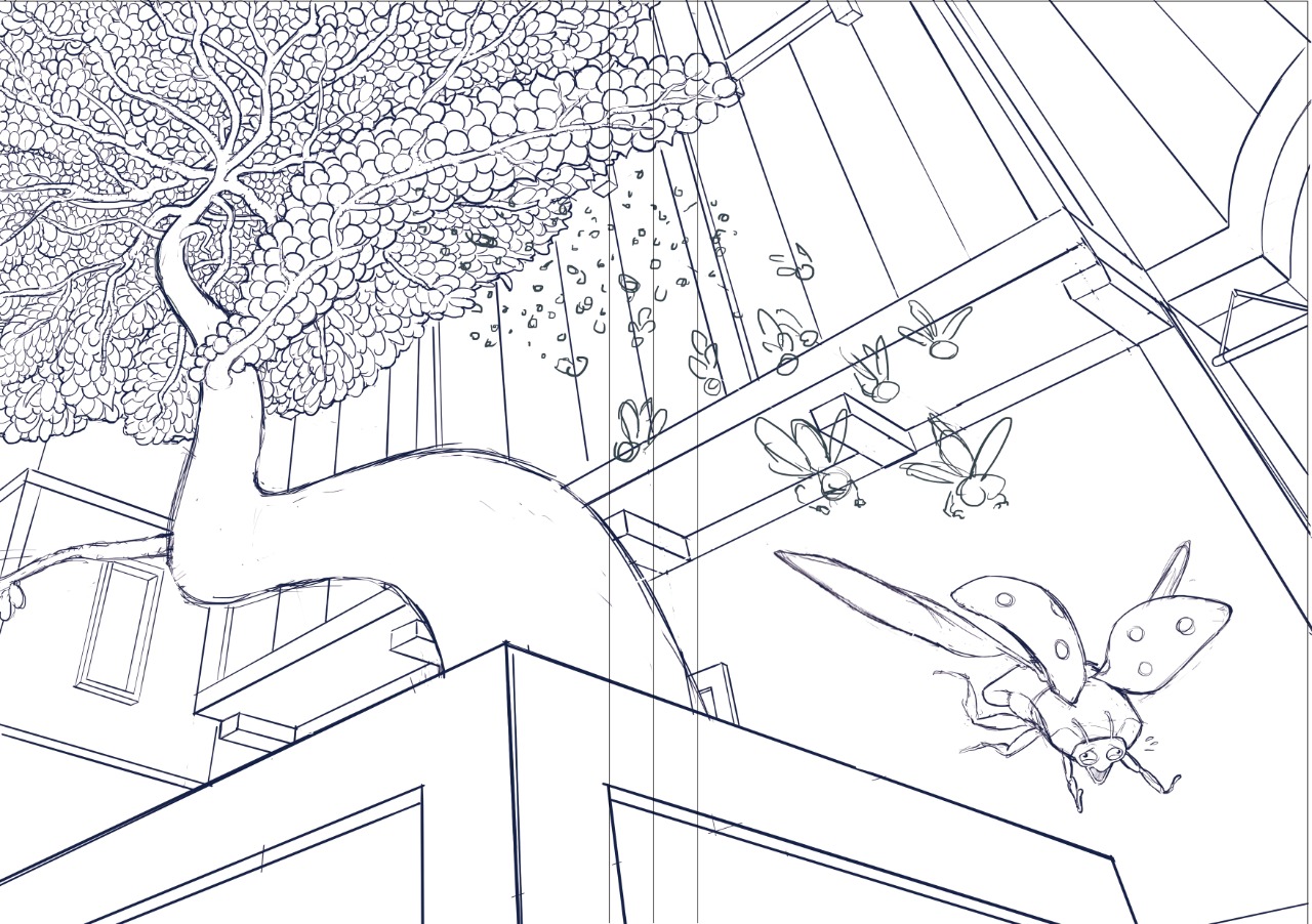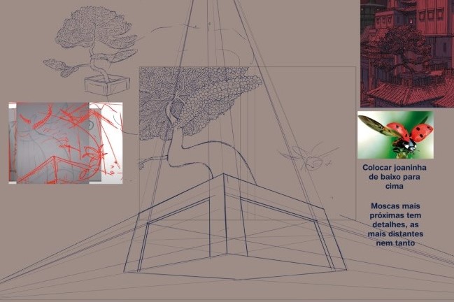 Todos os alunos tinham acesso a uma ilustração feita pelo professor Rapha Pinheiro (4º desenho), que serviu de inspiração. Optei por desenhar uma cena próxima à arvore de cerejeira da referência, onde um grupo de moscas da fruta se vingam de sua predadora natural, a joaninha. Assista o vídeo abaixo, no qual falo mais sobre o processo criativo.